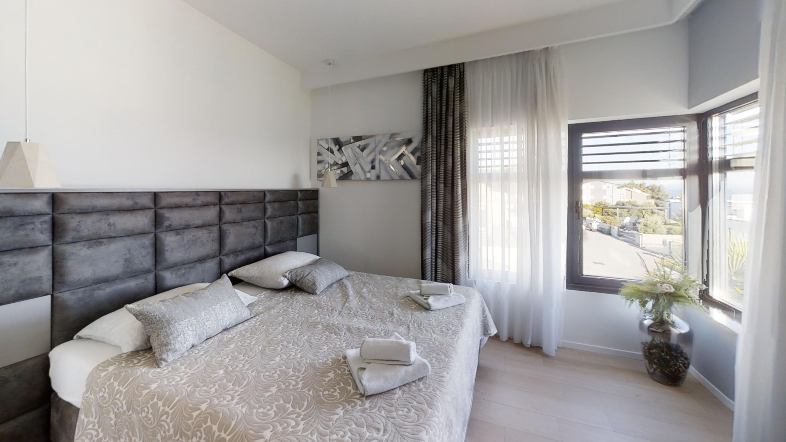 Luksuzna vila izgrađena je 2018. Godine. Nalazi se na vrlo aktraktivnoj lokaciji te ima otvoren pogled na more iz većine prostrorija. U prizemlju je smještena zatvorena garaža, sauna, jacuzzi, teretana, kupaonica te praonica rublja. Na prvom katu nalazi se kuhinja, blagovaonica te dnevni boravak iz kojeg se izlazi na prostranu terasu na kojoj se nalazi bazen te ljetnja kuhinja. Sa terase se pruža otvoren pogled na more. Osim navedenog, na prvoj etaži se nalazi jedna spavaća soba sa pripadajućom kupaonicom te dodatna kupaonica. Na drugoj […]