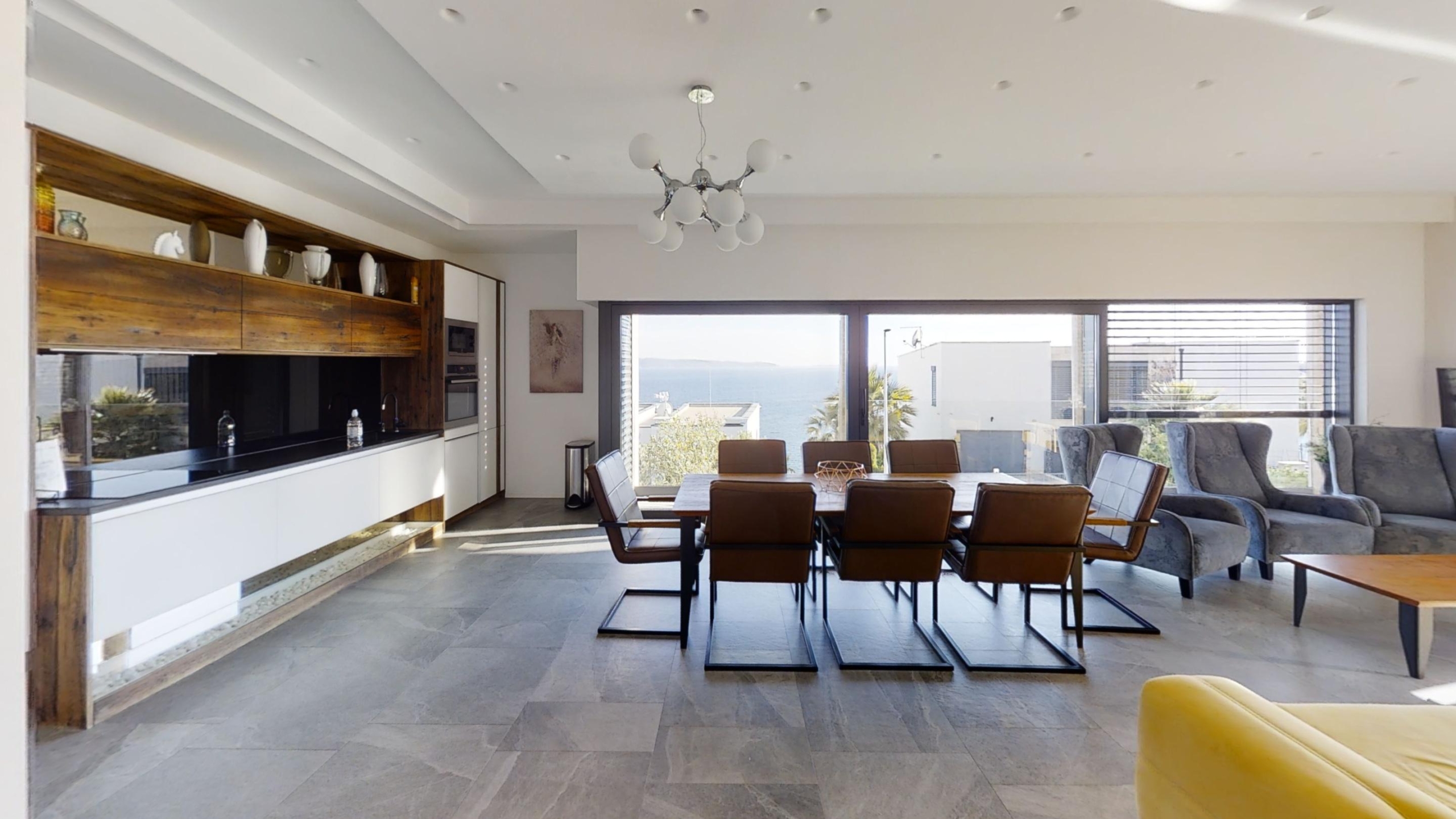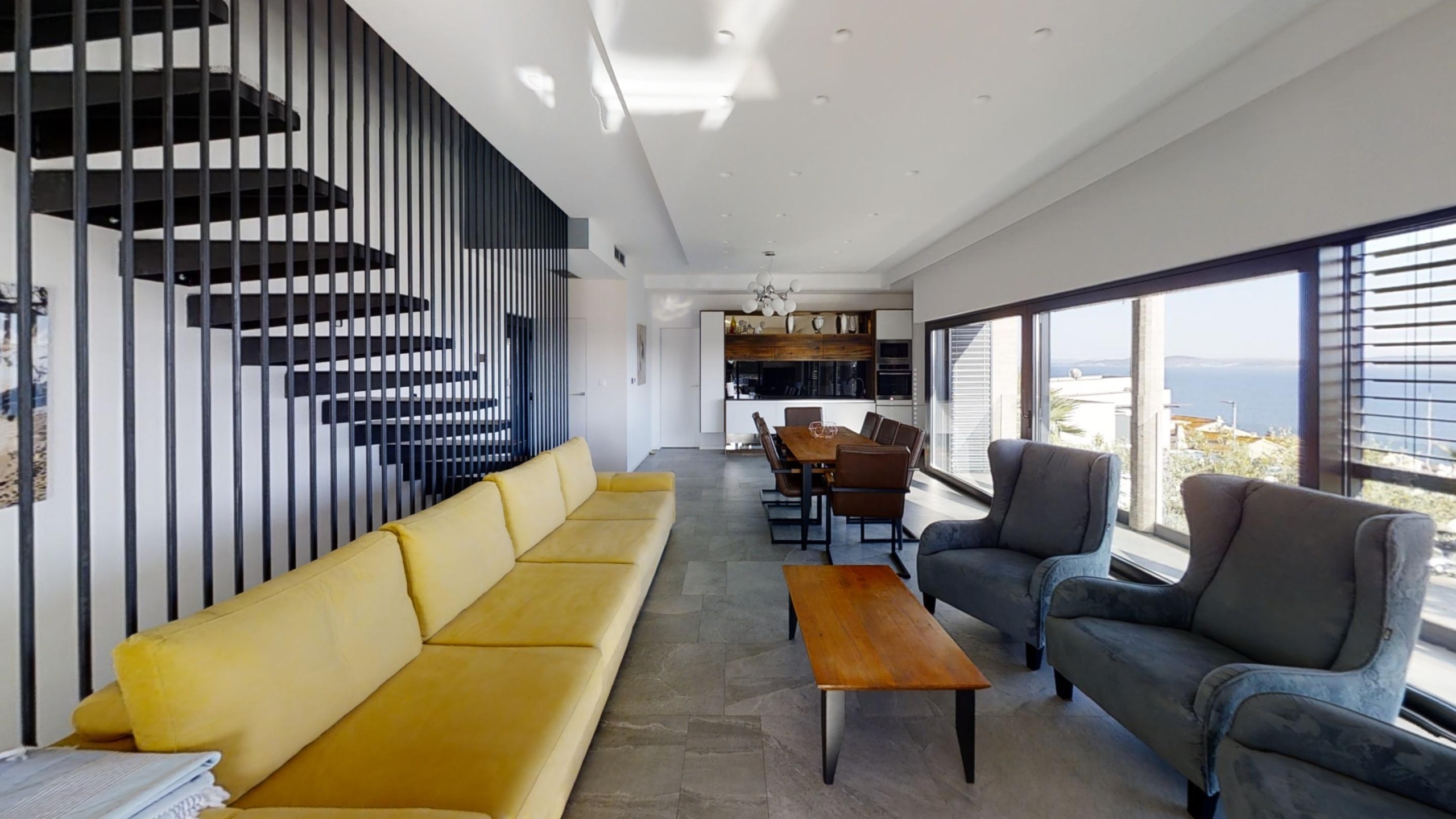 Na prvom katu nalazi se kuhinja, blagovaonica te dnevni boravak iz kojeg se izlazi na prostranu terasu na kojoj se nalazi bazen te ljetnja kuhinja.